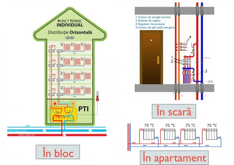 Soluţia modernă de termoficare, promovată de Termoelectrica, oferă mai multă economie, independenţă şi siguranţă, datorită sistemului de distribuţie a agentului termic pe orizontală (alimentarea cu agent termic pe două coloane (tur-retur) şi contorizare separată la nivel de apartament) cu Punct Termic Individual instalat în clădire.