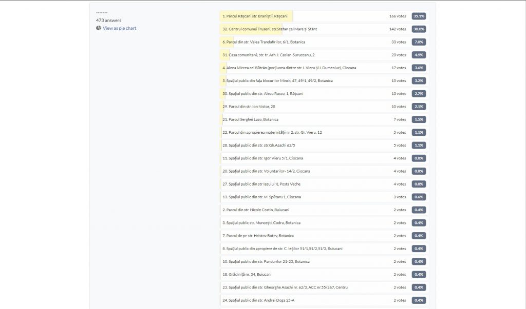 În cadrul concursului au fost înscrise circa 40 de propuneri de locații, dintre care 35 au fost selectate (cele cu adresele indicate) și supuse votului public desfășurat pe pagina oficială de Facebook a Termoelectrica S.A.. Parcul Râșcani din str. Braniștii a devenit câștigător după ce a fost propus în concurs de către mai mulți locuitori ai sec. Râșcani și a fost susținut cu cele mai multe voturi.