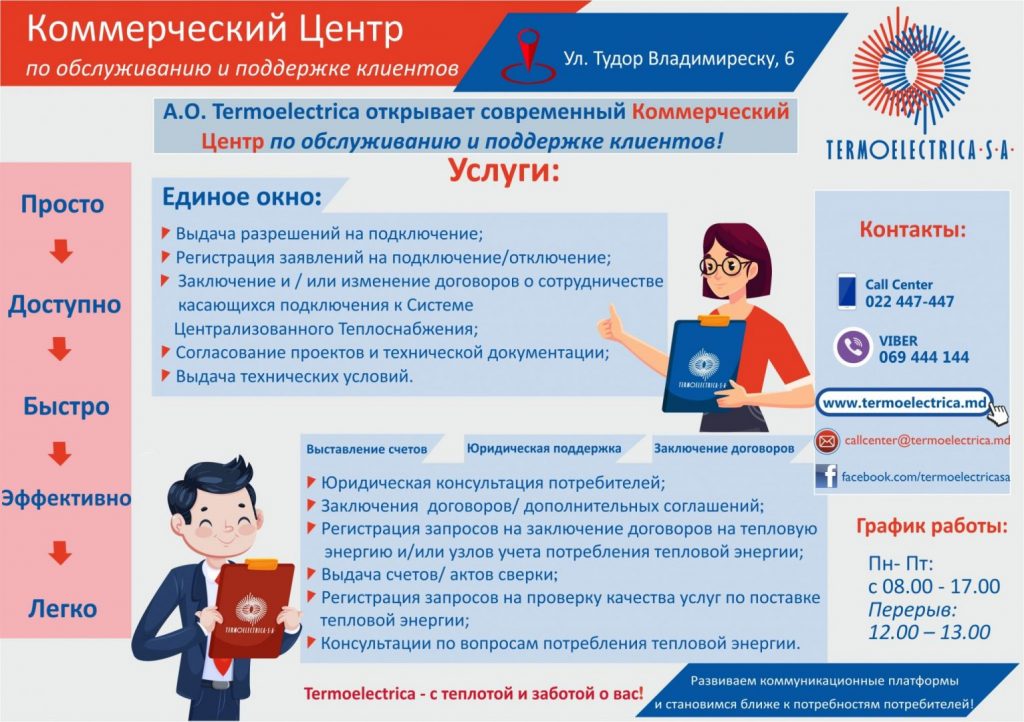 Potrivit directorului general al Termoelectrica, Veaceslav ENI, Centrul Comercial răspunde la multiple necesități ale consumatorilor, oferindu-le un acces mai comod și rapid la întreaga gamă de servicii puse la dispoziție de Termoelectrica: ”Dezvoltarea platformelor de comunicare și interacțiune cu consumatorii dintotdeauna ne-a preocupat. Din acest motiv am decis și modernizarea Centrului Comercial de deservire și relații cu consumatorii, operativ, rapid și comod – fără timp pierdut și cozi la ghișee”.