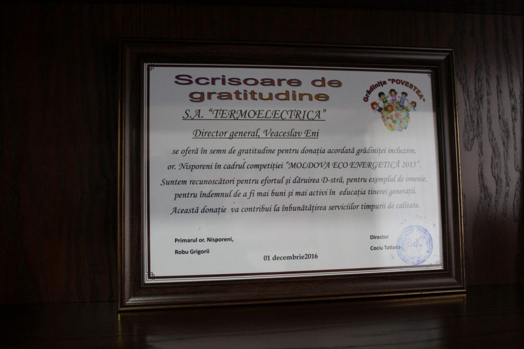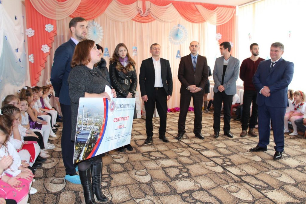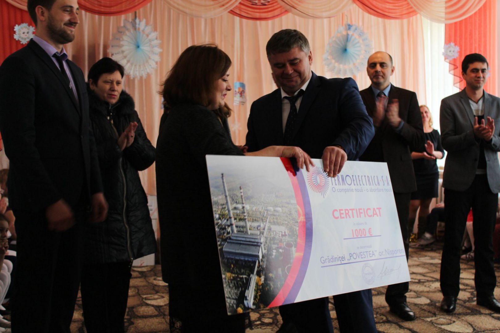 Totodată, administraţia Termoelectrica S.A. a oferit grădiniţei un cec în valoare de 1.000 de euro: “Prietenia dintre Termoelectrica S.A. şi grădiniţa ,,Povestea” a început acum un an, în cadrul concursului ,,Moldova Eco Energetica -2015”, la care au participat ambele instituţii. Premiul câştigat de noi, în cadrul concursului, am decis să îl donăm acestei grădiniţei. Ne bucurăm că astăzi, am reușit să aducem un motiv în plus de bucurie pe chipul acestor copilași. Reprezint o echipă de energeticieni, menirea cărora este să aducă lumină și căldură în casa oamenilor. Mă bucur că astăzi am adus-o în instituția dumneavoastră”, a menționat directorul general Termoelectrica S.A., Veaceslav Eni.