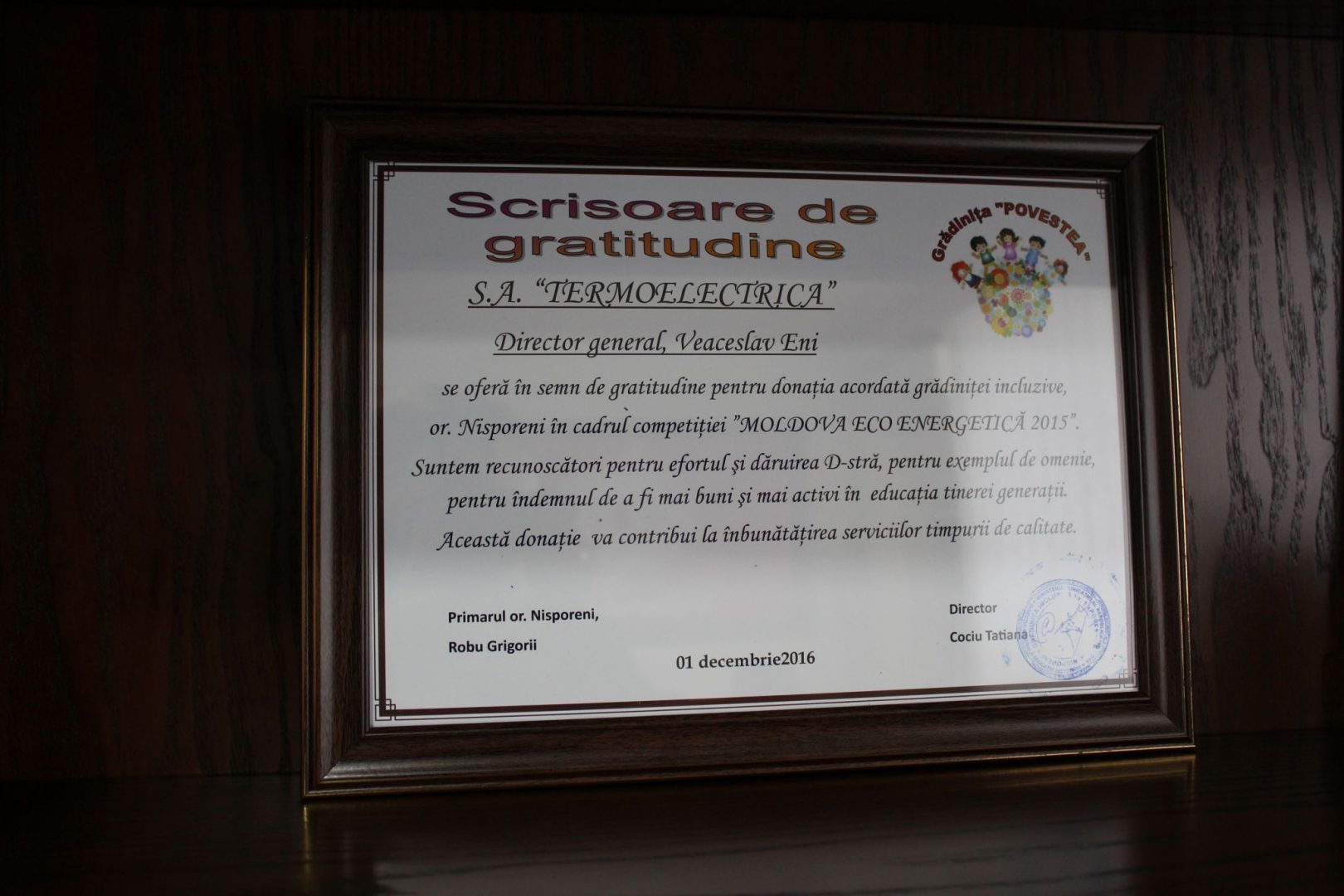 Cecul în valoare de 1.000 de euro, donat grădiniţei “Povestea”, constituie premiul obţinut de către Termoelectrica S.A. în cadrul concursului ,,Moldova Eco Energetica -2015”, pentru Cel mai bun Proiect de Eficienţă Energetică în sectorul energetic, la care Întreprinderea Termoelectrica S.A. a obţinut locul I. În cadrul aceluiaşi concurs, grădiniţa a fost nominalizată cu o diplomă de merit.