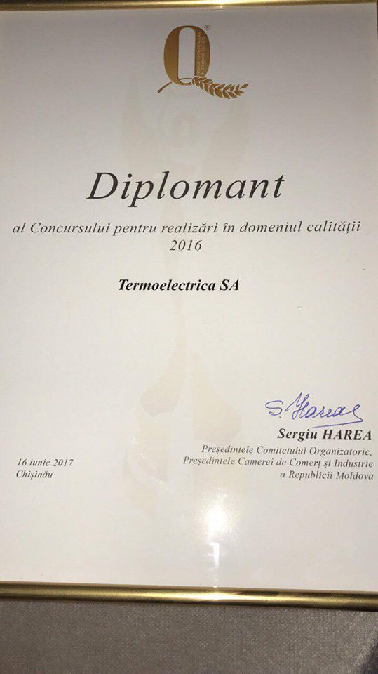 Societatea pe Acţiuni Termoelectrica a fost astăzi, 16 iunie 2017, premiată cu medalia de aur la Concursul Marca comercială a anului 2016, categoria „Produse şi Servicii în domeniul energeticii şi construcţiilor”,nominaţia „Marca Locală”. Totodată, în cadrul evenimentului, Termoelectrica a primit diplomă de merit pentru realizările în domeniul calităţii, înregistrate pe parcursul anului 2016.